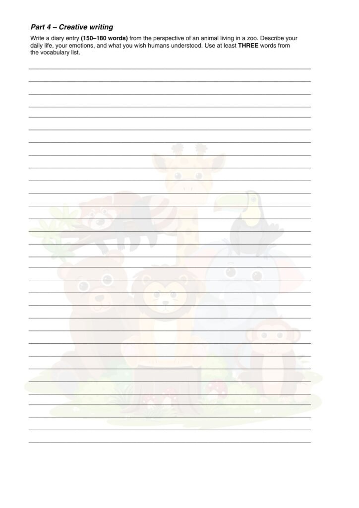 We then moved from reading to creative writing, where students wrote diary-style texts from the perspective of an animal living in a zoo. The focus was not on perfect grammar, but on voice, emotion, perspective, and message. Students were encouraged to reflect on what the animal feels, what it has lost, how it experiences humans watching it, and what “protection” really means. This shift immediately increased student engagement.